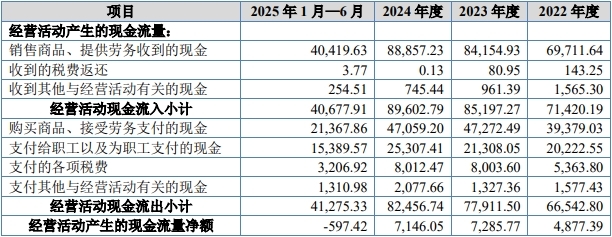 2022-2024年度及2025年1-6月,南特科技经营活动产生的现金流量净额分别为4,877.39万元、7,285.77万元、7,146.05万元和-597.42万元。销售商品、提供劳务收到的现金分别为69,711.64万元、84,154.93万元、88,857.23万元和40,419.63万元。