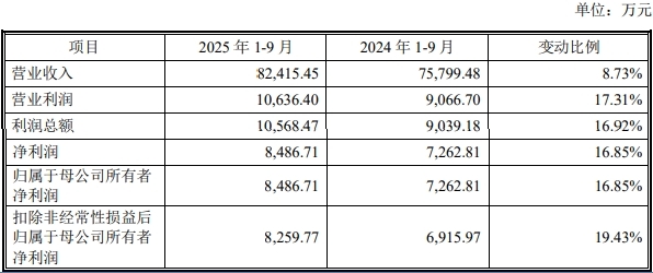 自2025年1月至2025年前9月,南特科技实现营业收入82,415.45万人民币,较去年同段同期相比上升8.73%;与此同时,南特科技的净利润达到了8,486.71万人民币,同比上涨16.85%。除去非经常性损益的影响之后,南特科技的归属于母公司股东净利润为8,259.77万人民币,较去年同期增加19.43%;与此同时,经营活动产生的现金流量净额从上年同期的4,756.16万人民币降到了-9,609.36万人民币。