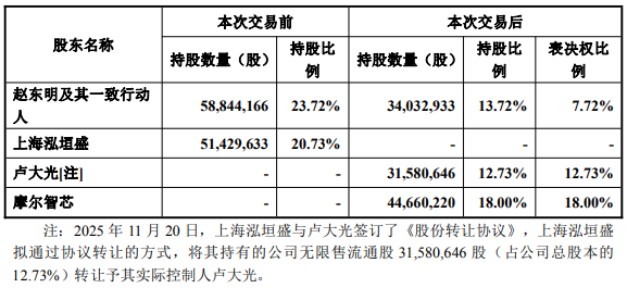 权益变动后,苏州和兴昌商贸有限公司和一致行动人蒋学元、赵茜菁合计持有公司13.72%的股权,表决权比例合计为6.85%。摩尔智芯及其一致行动人卢大光持有公司17.94%的股权,摩尔智芯成为公司控股股东,谢海闻成为公司的实际控制人。