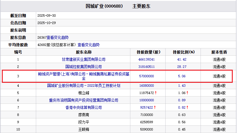 截止至2025年9月30日止,国城矿业的前三大股东当中,鲸域资产管理(上海)有限公司-鲸域腾晟私募证券投资基金持有股份比例为5.06%。
