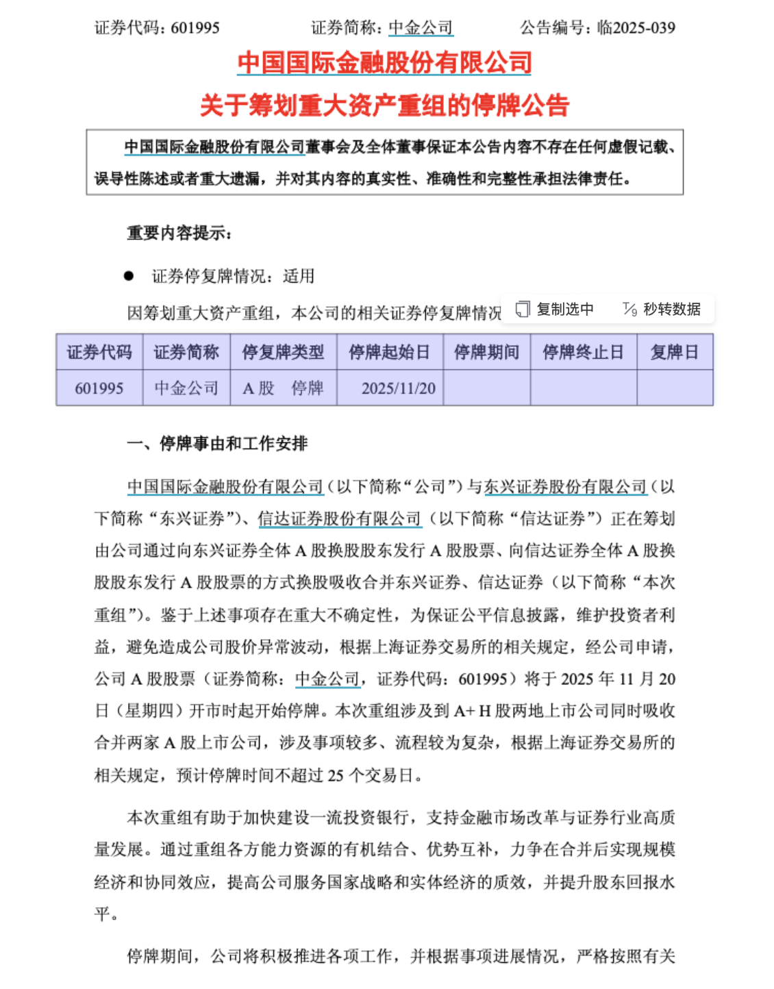 北京11月19日电 11月19日晚,中金公司、东兴证券和信达证券发布了《关于筹划重大资产重组的停牌公告》。据公告内容显示,三家机构正计划通过中金公司向东兴证券全体A股换股股东发行A股股票及信达证券全体A股换股股东发行A股股票的方式进行换股吸收合并东兴证券和信达证券。