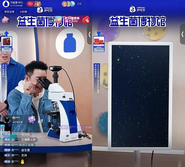 一声钟响标志着好菌登场!特邀嘉宾、微博大V@戴军敲响蓝色幸运钟后,万益蓝WonderLab直播平台开启了益生菌科普的大门。去年就成功打造过首个线下益生菌博物馆,今年在此基础上做了升级改进,在直播间中把博物馆搬了进来。利用沉浸式实验与互动体验来为消费者展现复杂的微生态,并将科学选菌指南以可感知信任的形态呈现出来,充分展现出万益蓝品牌所秉持的专业可循证理念及科研实力。