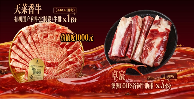 礼包中包含多种热门肉类,包括澳大利亚Coles谷饲牛肋排和国产和牛定制卷/排等多种产品;同时也丰富了海鲜选择,包括新鲜冻黑虎虾、泰国大号熟冻罗氏沼虾、鲜京采活黑金大连即食海参以及无抗鲷鱼/罗非鱼排等。此外,还有湾仔码头裙带菜杏鲍菇水饺、袁记味享玉米鲜肉大云吞和思念xLoopy联名羽衣甘蓝茉莉青提汤圆等主食及小吃;安火锅丸料组合和用庭手打潮汕牛肉丸等是必不可少的食材,足以满足消费者对一顿美味火锅大餐的所有想象。