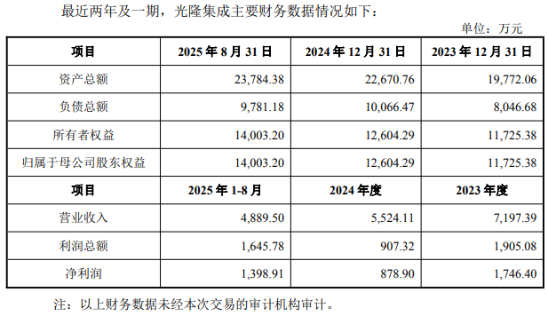 2023年,2024年以及从2024年1月到8月底的前8个月,光隆集成营业收入分别为7,197.39万元、5,524.11万元及4,889.50万元。同期净利润分别为1,746.40万元、878.90万元及1,398.91万元。从2024年的年度营收上,光隆集成的营业额同比下降了23.25%,而其利润在同期内的下滑量则是达到了49.67%。