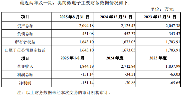 在2023年和2024年,奥简微电子的营收分别是1,837.99万元和2,712.84万元,净利润分别为-65.65万元和-30.86万元。
