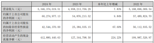 2024年度,英唐智控营业收入为53.46亿元,与前一年同期相比上升7.83%;归属于上市公司股东的净利润为6027.50万元,较上年增加9.84%;扣除非经常性损益后的净利润为4254.44万元,较上期增长了67.60%,经营活动产生的现金流量净额达到4.13亿元,与前一年同期相比上升了224.22%。