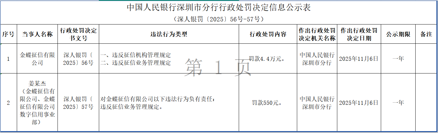 近日,北京11月25日消息 深圳市人行近期发布行政处罚决定信息公示表(深人银罚〔2025〕56号-57号)。金蝶征信有限公司涉及违规行为如下:一、违反征信机构管理规定;二、违反征信业务管理规定。深圳市人行依据上述事实,作出以下处罚:对该单位处以罚款4.4万元的行政处罚决定。
