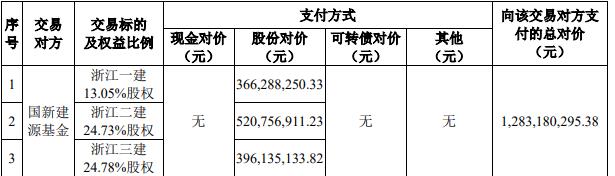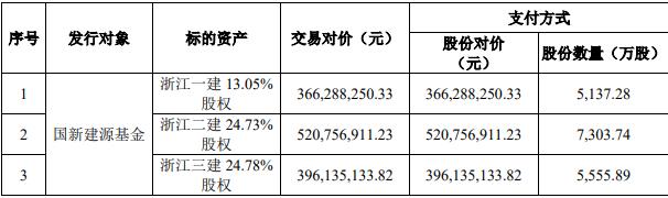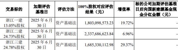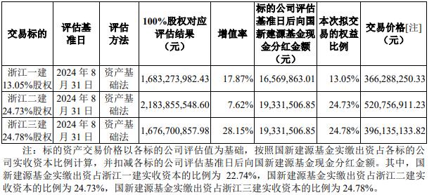 根据坤元出具并已备案的资产评估报告,在评估基准日2024年8月31日,浙江一建100%股权的评估价值为1,683,273,982.43元;浙江二建100%股权的评估值为2,183,855,548.60元;浙江三建100%股权的评估值为1,676,700,857.98元。基于该评估价格和向国新建源基金已分配现金红利,交易双方协商一致最终确定标的资产的交易对价为1,283,180,295.38万元人民币。