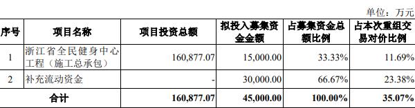 此次募集资金将扣除所有发行费用和中介机构费用,剩余部分主要用于并购标的公司正在建设中的项目,同时也会考虑补充上市公司运营所需的流动资金。在募集配套资金中用于浙江省全民健身中心项目的建设计划、以及用于补充流动资金的预算,合计占本次重组交易价的25%以内。