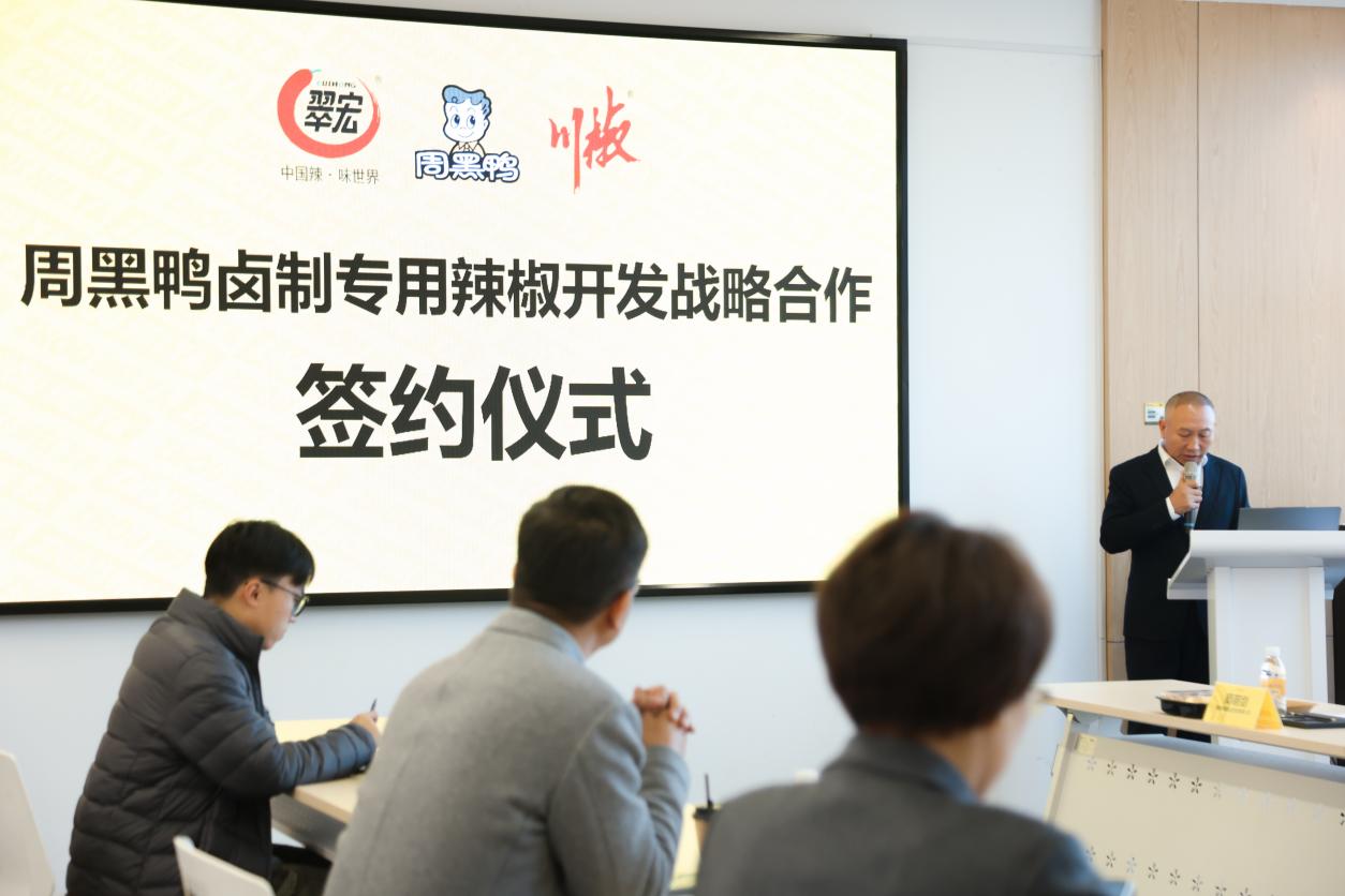 2025年11月19日,在周黑鸭总部举行了战略合作仪式。当天,周黑鸭与四川翠宏食品、四川川椒种业达成了合作意向,三方将发挥各自优势,并携手创新,共同研发适合于卤味产业的新辣椒品种,这不仅意味着周黑鸭首次涉足上游香辛料定制开发领域,也是行业中首例达成香辛料定向开发的突破性举措。