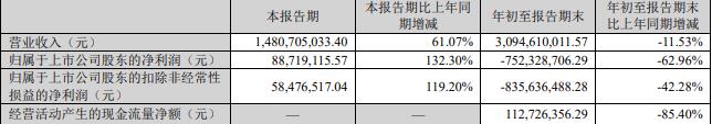 截至本季度报告发布时,公司营业收入总额为14.81亿元,在第三季度期间内同比增长了61.07%。相较于前一年同期,公司的净利润实现了132.30%的增长;在扣除非经常性损益后,归属于上市股东的净利润同样取得了119.20%的增长。