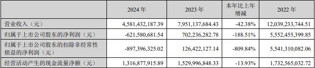 根据公司于2024年的年度报告显示,本报告期内营业收入为人民币45.81亿元,与2022年同期相比下降了42.38%,营业利润出现了亏损,并且归属于上市公司股东的净利润更是达到了人民币-6.22亿元。扣除非经常性损益之后的净利润也是减少了人民币8.97亿元。经营活动产生的现金流量净额也降至13.17亿元,相比去年同期下降了13.93%。