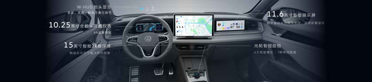 基于“好用”和“想用”的理念,全新探岳L智能座舱以5+X多屏多模交互系统为核心。该系统由五块屏幕组成:包括15英寸2K中控显示屏、11.6英寸副驾娱乐屏,这些屏幕上设有丰富的内容生态,灵动又默契;此外还有10.25英寸全数字液晶仪表盘,具备AR实景导航功能,能将导航信息与路面实况结合,确保驾驶更专注安全。此外,抬头显示HUD同样注重安全设计,可触摸光轮智控旋钮用于调节音量和切换驾驶模式,操作更加便捷。