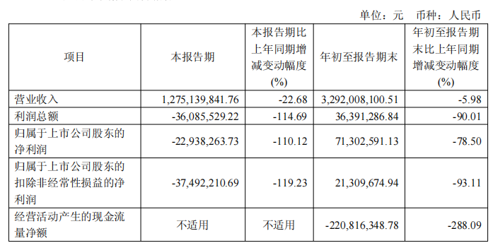 正帆科技(688596.SH)晚间宣布今年前三个季度公司营业收入达32.92亿元,同比减少5.98%,归属上市公司股东净利润7130.26万元,与去年同期相比下滑78.5%,归属于上市公司股东的非经常性损益净亏损2130.97万元,相较同期减少93%;营业活动产生的现金流量为负数,亏损高达-2.21亿元,同比下滑了288%。