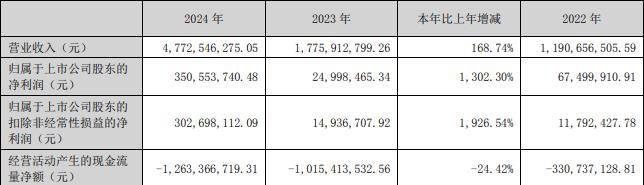 根据公司最新的年报数据:在截止至2024年的财务报告中,公司的营业收入达到了创纪录的47.73亿元,并且增长了惊人的168.74%;与此同时,归属于上市股东的净利润也翻了一番达到惊人的3.51亿,而扣除非经常性损益后的净利更是猛增至3.03亿,实现了超过一倍的增长。此外,在财务报告中的一个重要数据是:经营活动产生的现金流量净额从上一年度的-10.15亿元下降到了-3.31亿元,这表明公司的运营表现有所改善。