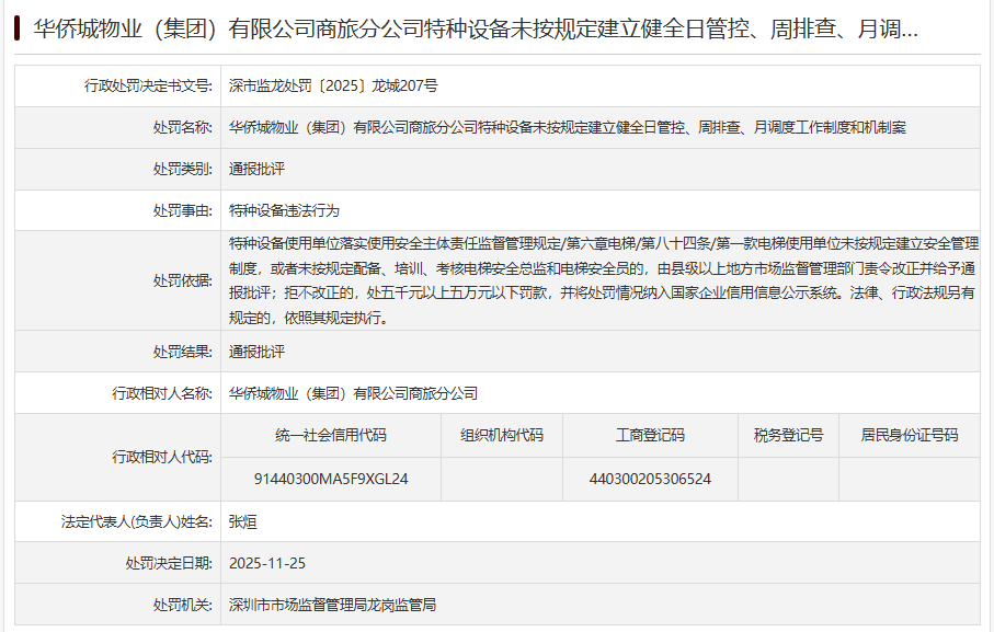华侨城物业(集团)商旅分公司未按照规定的日管控、周排查、月调度工作制度及机制建立健全特种设备管增值税发票开票软件税务ukey版g5【代办电话13434104765;QQ2188982664】理程序案显示华侨城物业(集团)商旅分公司存在电梯安全管理方面的违法行为。根据《特种设备使用单位落实使用安全主体责任监督管理规定》第六章“电梯”第八十四条第一款的规定,深圳市市场监督管理局龙岗监管局对其作出通报批评的行政处罚。