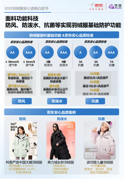 白皮书详细介绍了产品的面料与工艺特点包括具有防风、防水等多种功能的高级科技如防油防污、抗菌和耐用性能良好的产品等。同时,京东安心品质标准也对这些高科技产品进行了详细分级比如在防风性能上透气率≤5mm/s的产品是AAA级产品可以有效阻止冷风侵入;而钻绒优等产品的每平方米钻绒根数不超过40根。