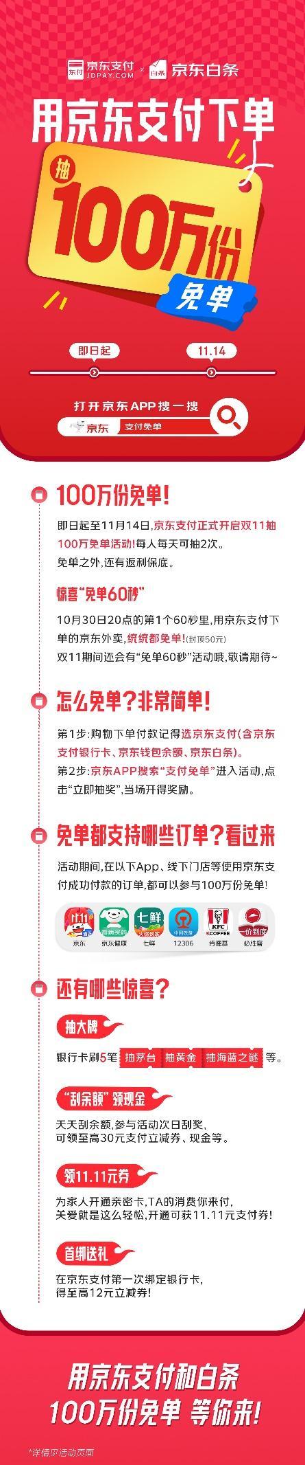 此前京东方面就曾公布过在京东购物时使用京东支付进行下单消费者就有资格参与抽免单活动整个11.11活动期间提供百万份免费购买的机会每笔订单都有机会获得优惠在手机应用商城搜索关键词“支付免单”即可参与此次活动